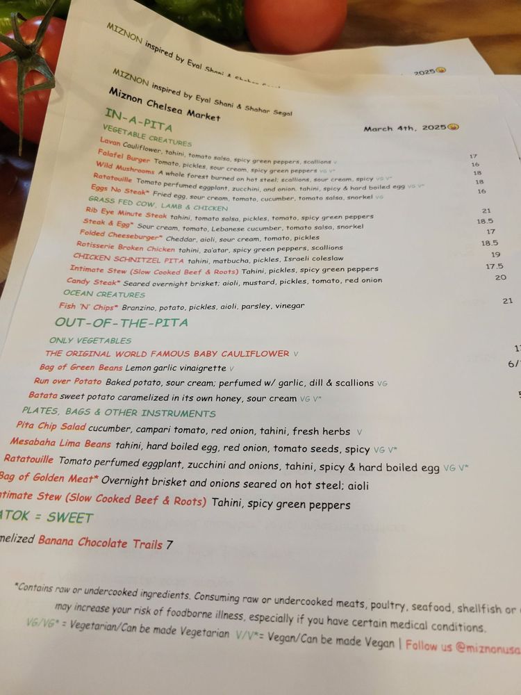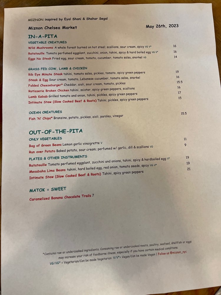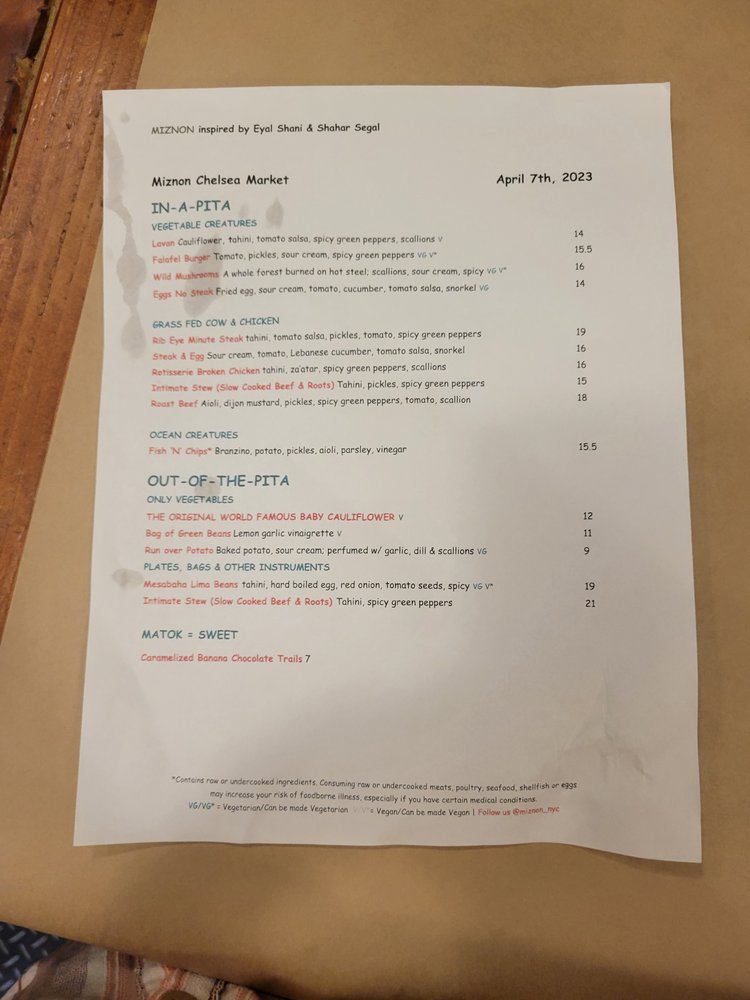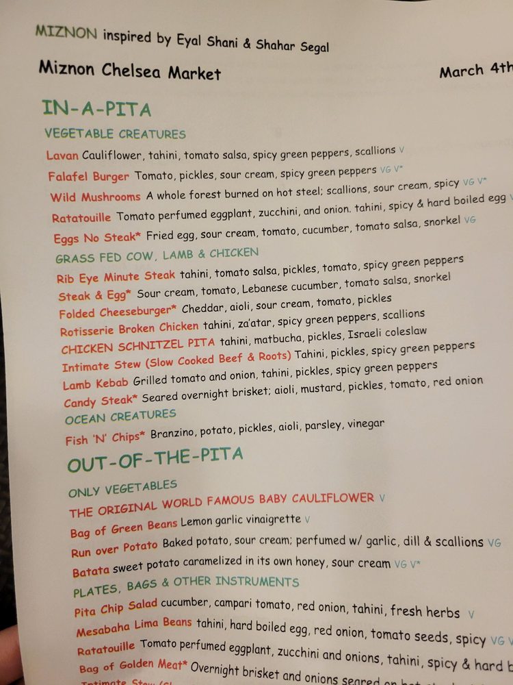 “ I decided to check out Chelsea Market for lunch and my colleague gave different suggestions such as Israeli street food. I wanted something casual and different so I was down. They claimed to have fresh ingredients and locations globally. It's located on the main concourse. There was so many items that I wanted to order from the menu, but I got the pita entree. There's a vegetarian and non-vegetarian section. I got the Intimate Stew (slow cooked beef & roots) with tahini and spicy green peppers. It was pretty good. I recommend it and the place. ”