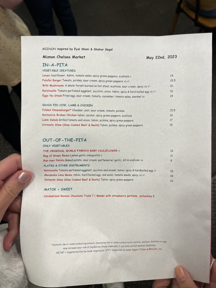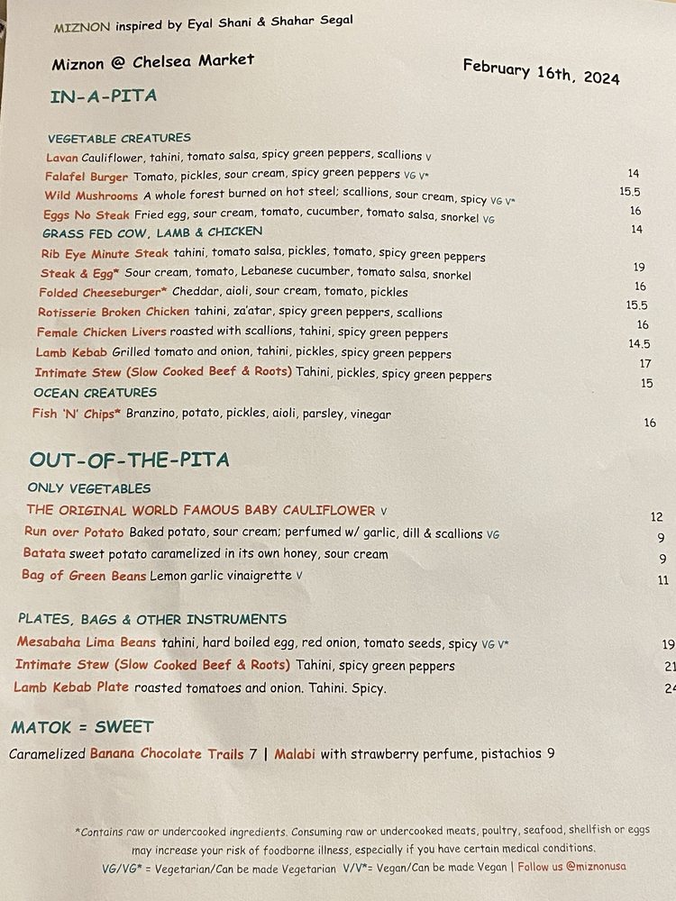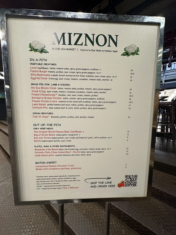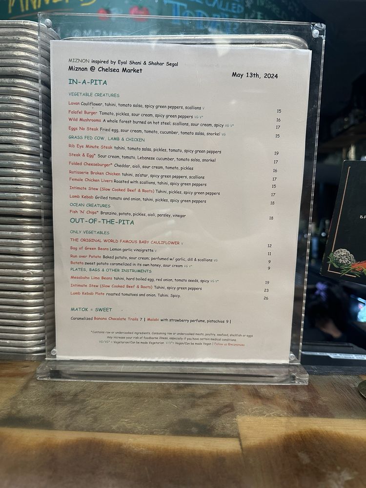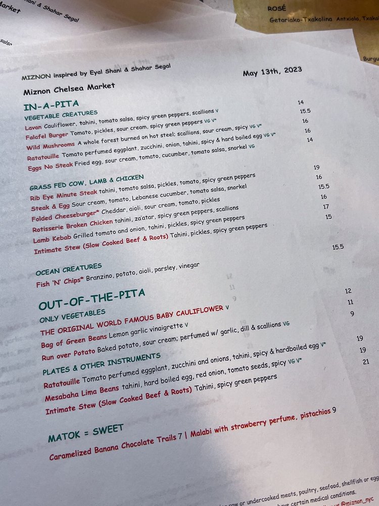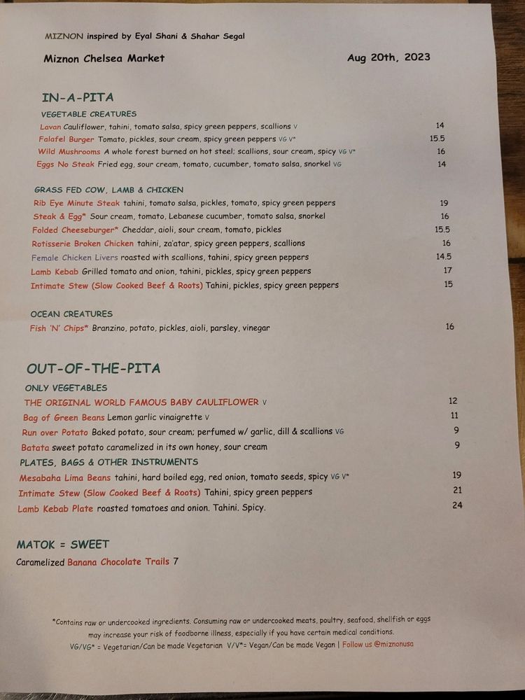“ Okay! One of my favorite things about walking the Highline to Chelsea Market is grabbing a bite at Miznon! When I tell you that everything on the menu is good, I mean it. I have coerced so many of my veggie hating friends to try their cauliflower and green beans, and they LOVED them. So so good! I also love the folded cheeseburger and minute steak! It's a very clean location with great service and indoor/outdoor seating. ”